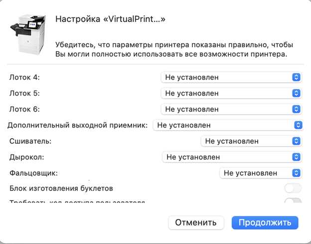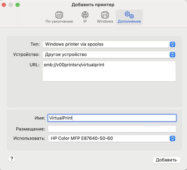- Тип: Windows printer via spools - Устройство: Другое устройство - URL: smb://v00printsrv/virtualprint - Имя: VirtualPrint - Использовать: выбрать«Выбрать ПО»и указать «НР CoIor МFР E87640-50-60»