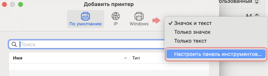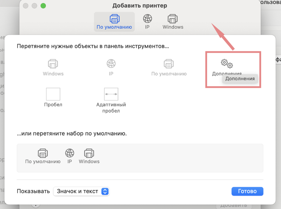 2. В области «Добавить принтер» вызываете контекстное меню «Настроить панель инструментов» и перемещаете пункт «Дополнения» в рабочую область и нажимаете кнопку «Готово»