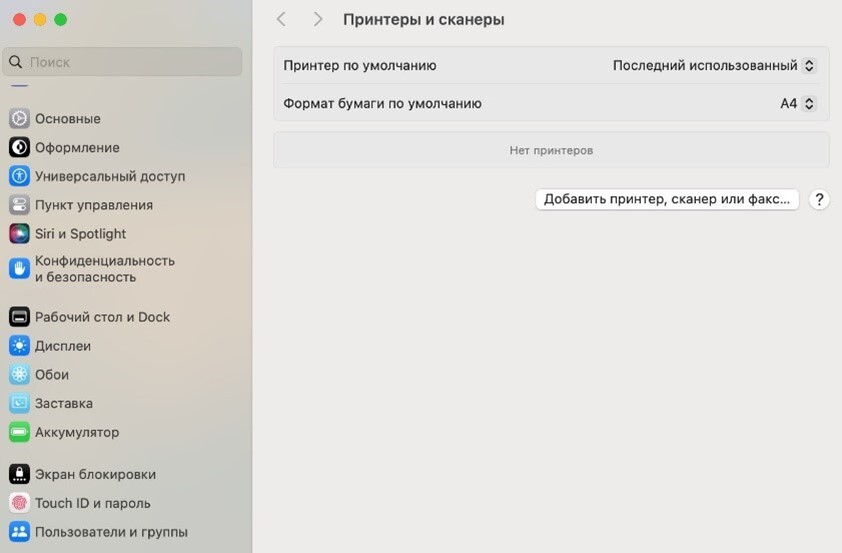 1. Откройте «Системные настройки» -> «Принтеры и сканеры» -> «Добавить принтер, сканер или факс…»